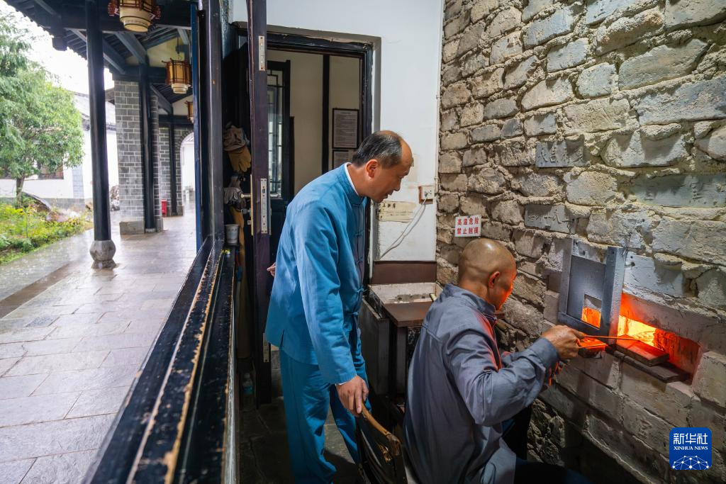 11月19日,在保山市永子文化园,李国伟(左)指导徒弟张佳林滴制永子。