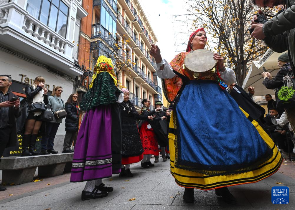 当日,来自西班牙马德里自治区及周边省份的传统民谣弹唱团与民俗表演队在马德里市中心街道上进行音乐巡游,通过演奏传统乐器和演唱歌曲营造节日气氛。