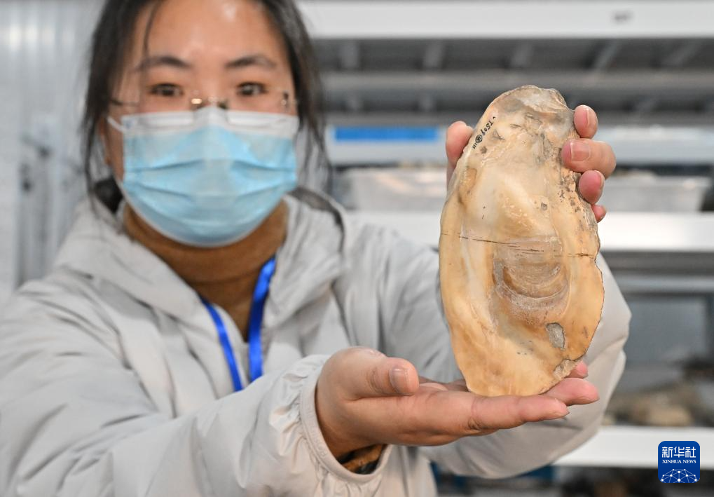 工作人员在井头山遗址文物库房内展示出土的贝耜工具(12月15日摄)。