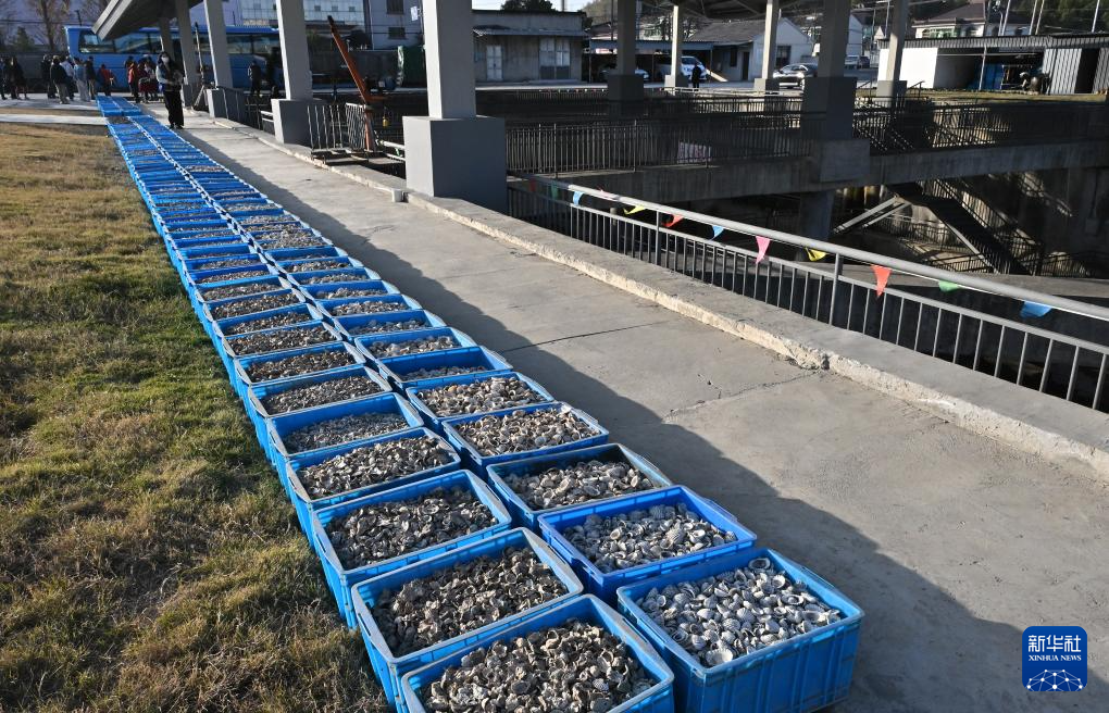 井头山遗址第二期发掘区外展示大量贝壳类遗物(12月15日摄)。