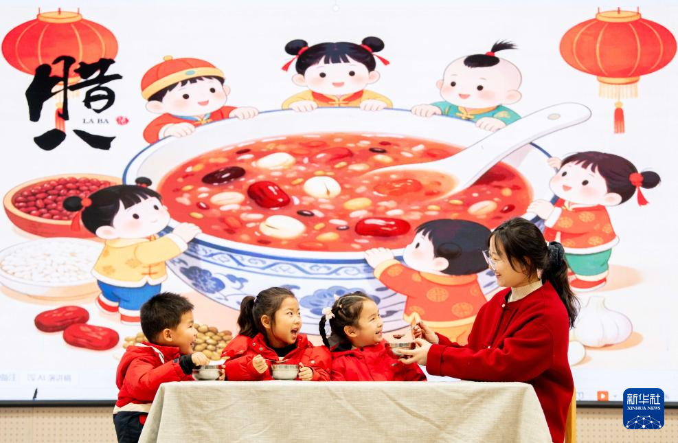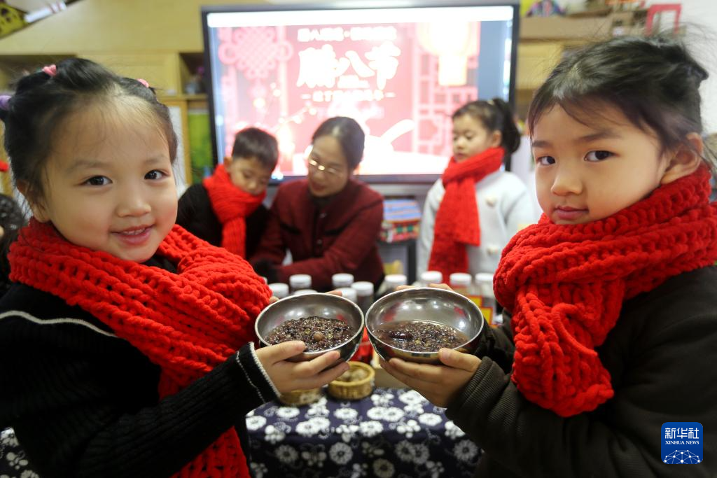 1月26日,小朋友在浙江省温州市鹿城区万源社区品尝腊八粥。