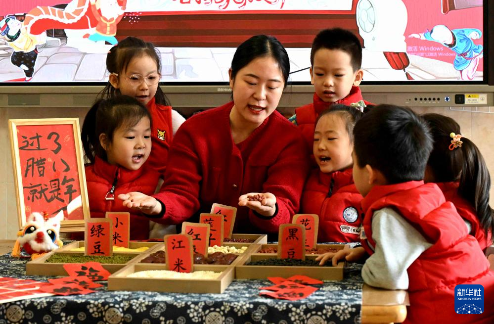 1月26日,在河南省济源市第一幼儿园,老师教小朋友们辨认制作腊八粥的食材。