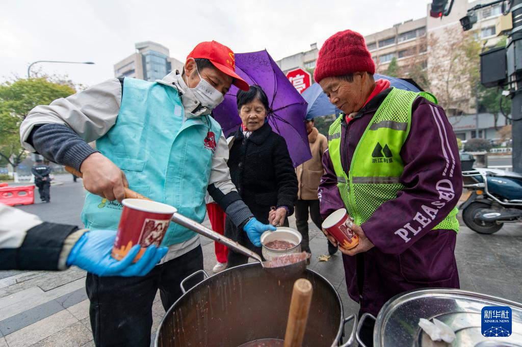 1月26日早晨,在浙江省金华市市区,当地总工会和爱心公益协会工作人员在街边给户外劳动者和市民免费发放腊八粥。
