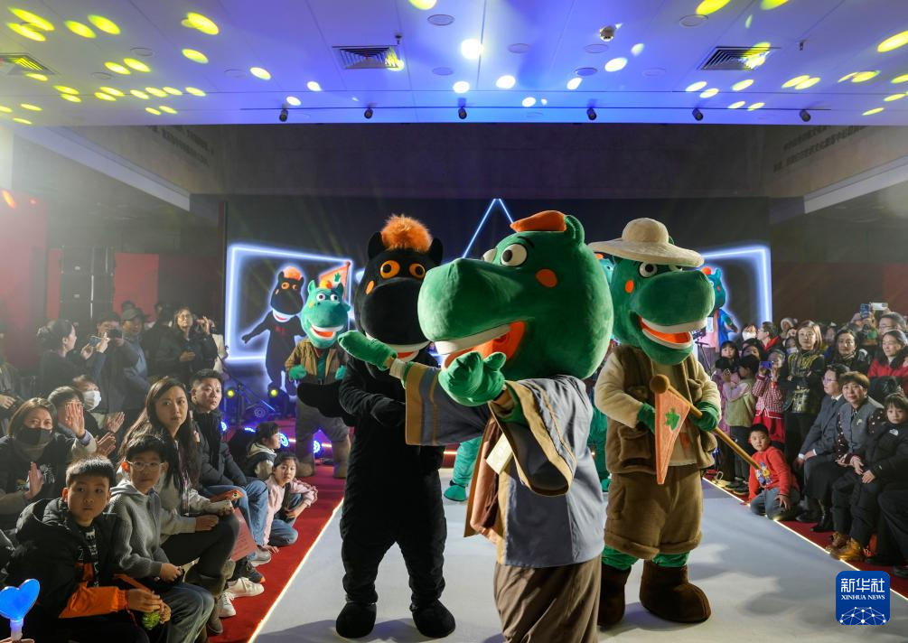 1月26日晚,在甘肃省博物馆一楼大厅,马踏飞燕IP人偶在“马力全开——博物馆启航夜”活动现场与观众互动。