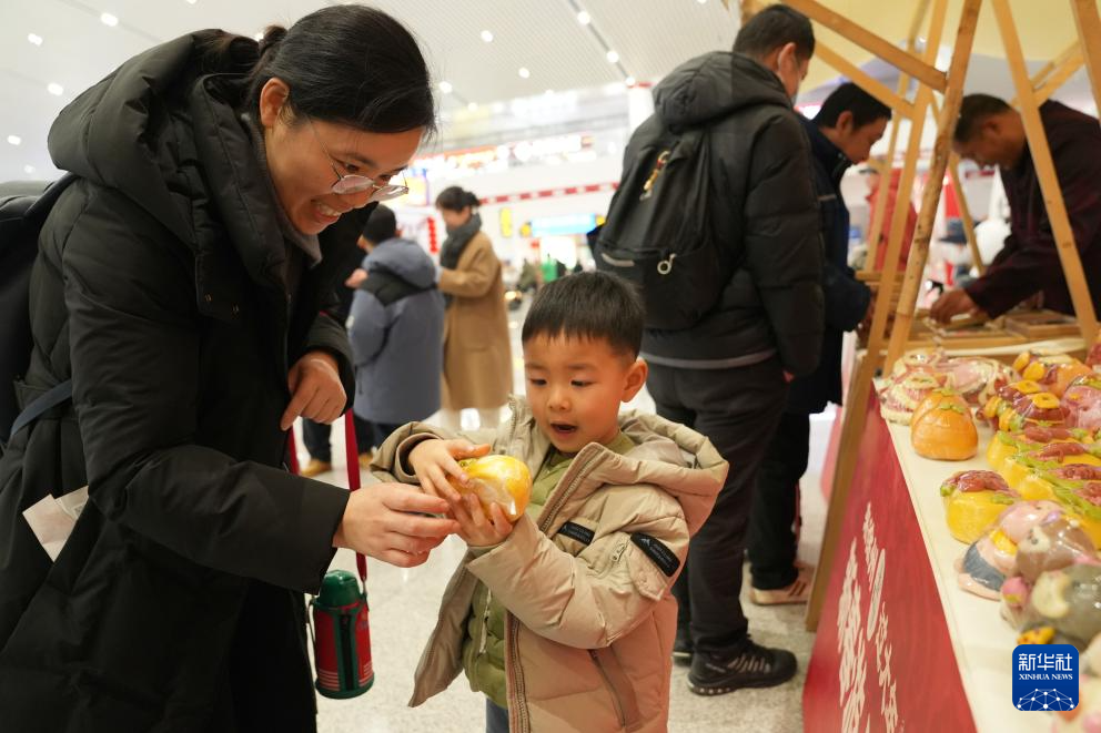 2月10日,在徐州东站,小旅客欣赏手工花馍。