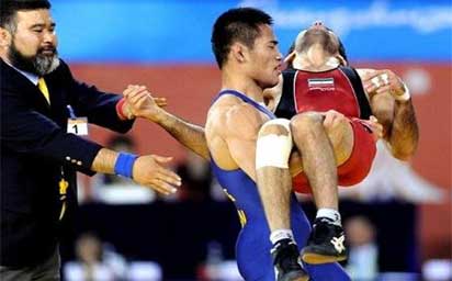 亚运赛场上中国名将抱受伤对手下场