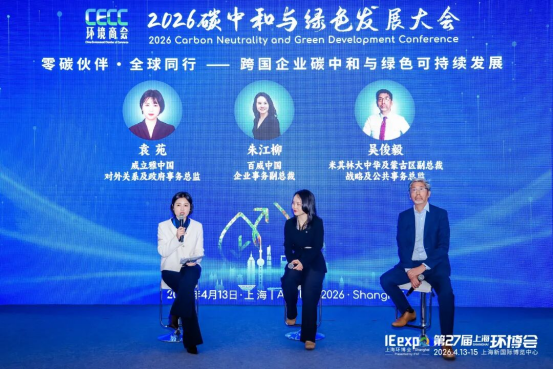会议现场,威立雅中国对外关系及政府事务总监袁苑与百威中国企业事务副总裁朱江柳、米其林大中华及蒙古区副总裁/战略及公共事务总监吴俊毅围绕“零碳伙伴・全球同行 —— 跨国企业碳中和与绿色可持续发展”主题展开精彩对话。