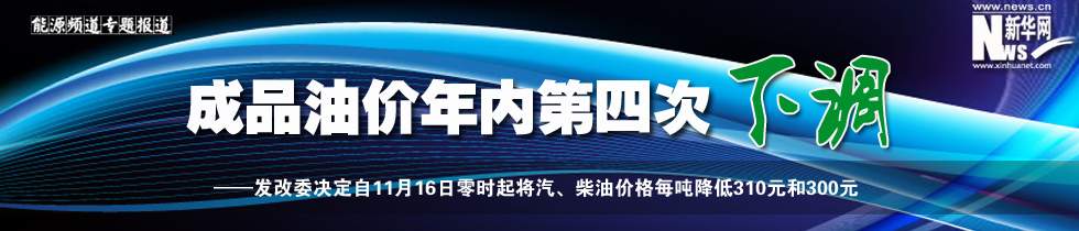 發(fā)改委決定自11月16日零時(shí)起將汽、柴油價(jià)格每噸降低310元和300元,折算到90號(hào)汽油和0號(hào)柴油(全國(guó)平均)每升零售價(jià)分降0.23元和0.26元。 [詳細(xì)]