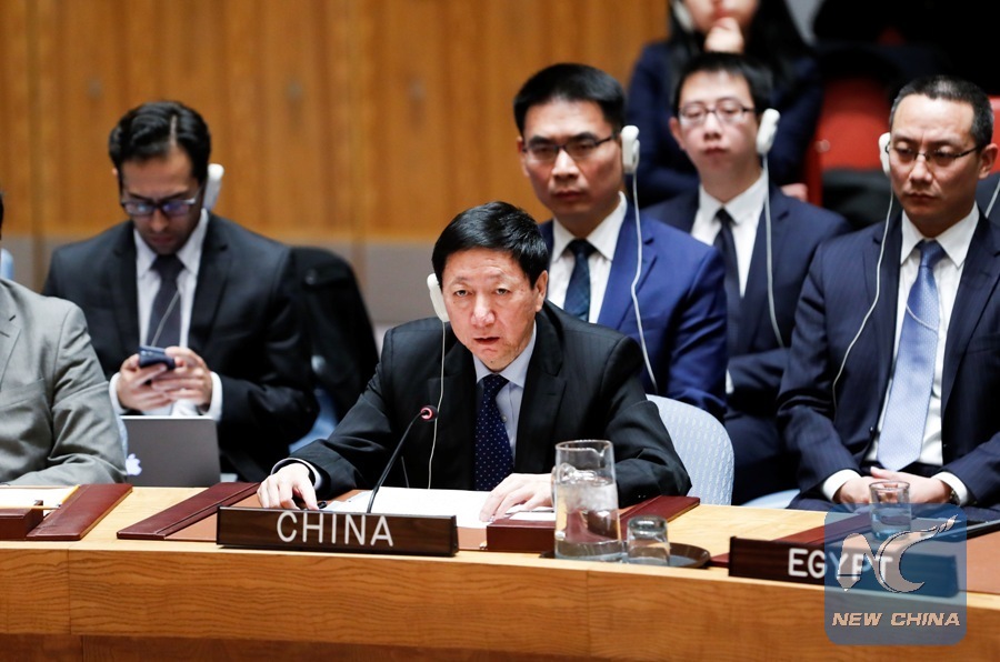Wu Haitao (Front), charge d'affaires of China's Permanent Mission to the United Nations, speaks after the United Nations Security Council adopted a resolution on the Democratic People's Republic of Korea (DPRK) at the UN headquarters in New York, on Dec. 22, 2017. The Security Council on Friday adopted a new resolution to further tighten sanctions against the DPRK in response to Pyongyang's ballistic missile launch on Nov. 28. (Xinhua/Wang Ying)
