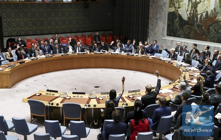 Photo taken on Dec. 22, 2017 shows the United Nations Security Council voting on a resolution on the Democratic People's Republic of Korea (DPRK) at the UN headquarters in New York. (Xinhua/Wang Ying)