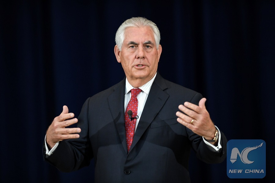 File photo: U.S. State Secretary Rex Tillerson makes his second address to all Department employees in Washington D.C., capital of the United States, May 3, 2017. (Xinhua/Bao Dandan)