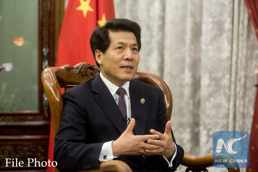 Chinese Ambassador to Russia Li Hui speaks in a joint interview with Chinese and Russian media in Moscow, Russia, on November 22, 2017. (Xinhua/Evgeny Sinitsyn)