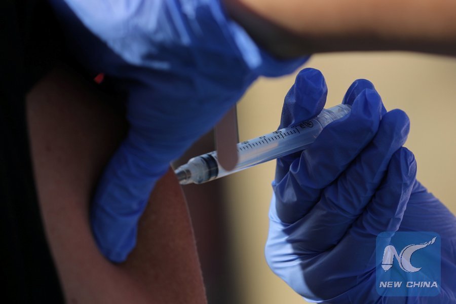 A homeless person is flu vaccinated as she registered to enter as transitional camp area for homeless people at the city's works yard in San Diego, California, U.S., Oct. 9, 2017. (Xinhua/REUTERS)