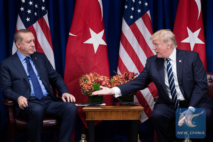 (FILES) This file photo taken on September 21, 2017 shows U.S. President Donald Trump reaching to shake Turkey's President Recep Tayyip Erdogan's hand before a meeting at the Palace Hotel during the 72nd United Nations General Assembly in New York City. (AFP PHOTO)