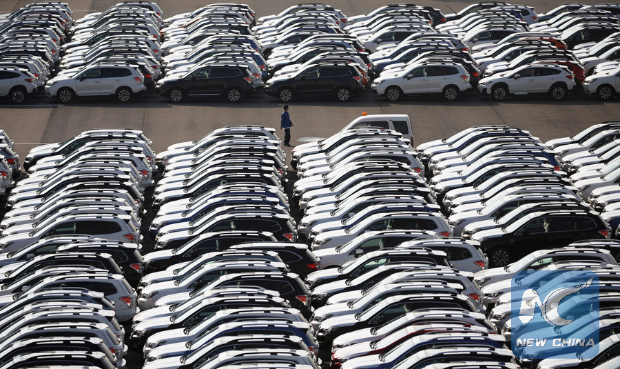 A worker is seen among newly manufactured cars awaiting export at port in Yokohama, Japan, November 15, 2017. (REUTERS PHOTO)