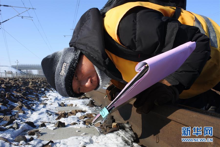 A railway worker checks the rails along the Harbin-Suifenhe line in Yabuli Town, Shangzhi City, northeast China’s Heilongjiang Province, Jan. 23, 2018. (Xinhua/Zhang Chunxiang)
