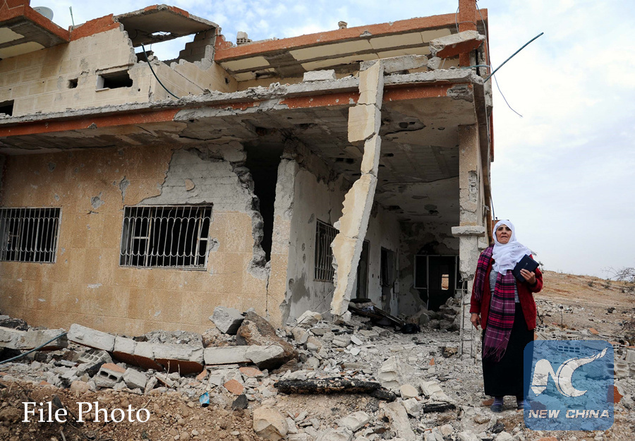 A woman stands in front of her destroyed house in the town of Mughor al-Mir, one of the three towns as the last strongholds of rebels, largely those affiliated with the al-Qaida-linked Nusra Front, in the Western Ghouta countryside of Damascus, capital of Syria, on Dec. 29, 2017. (Xinhua/Ammar Safarjalani)