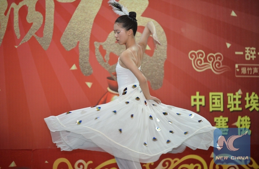 A Chinese performs a peacock dance during celebration of the upcoming Chinese Spring Festival was playing darts on Feb. 9, 2018 in Addis Ababa, Ethiopia. (Xinhua/Michael Tewelde)