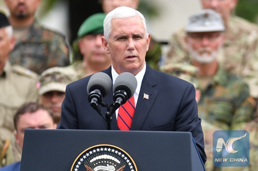 File Photo: Visiting U.S. Vice President Mike Pence speaks at the meeting with military personnel of NATO battlegroup in Estonia, in Tallinn, capital of Estonia, July 31, 2017. (Xinhua/Sergei Stepanov)