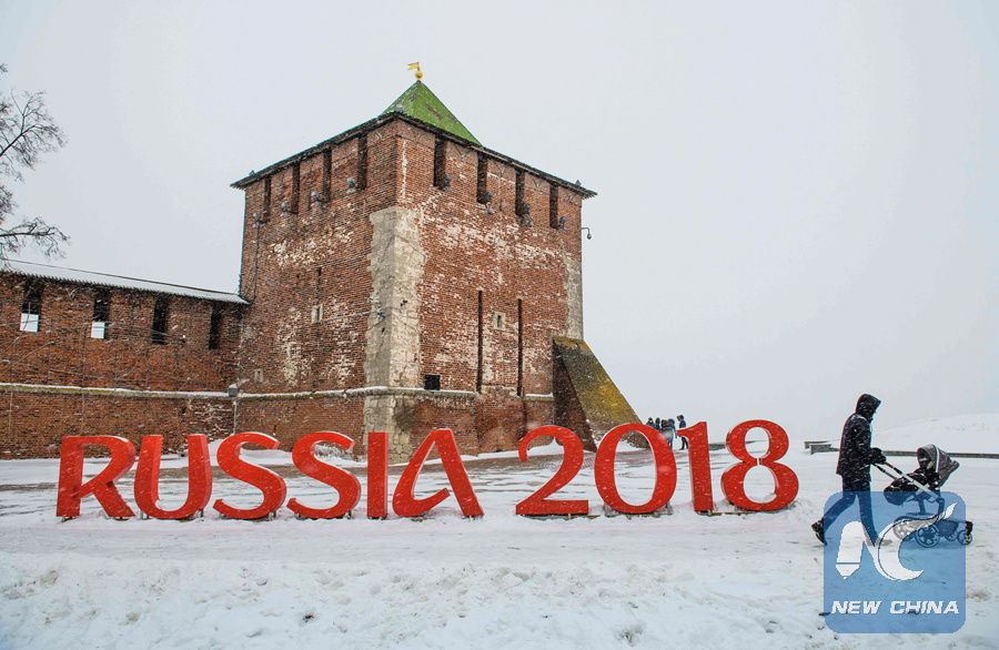 A man pushes a stroler past a FIFA World Cup 2018 emblem placed in front of the Nizhny Novgorod's Kremlin on January 21, 2018. (AFP PHOTO)