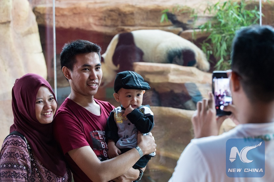 Tourists pose for photos with the giant panda Huchun in the background at Taman SafariIndonesia in Togor, Indonesia, March 24, 2018. (Xinhua/Du Yu)