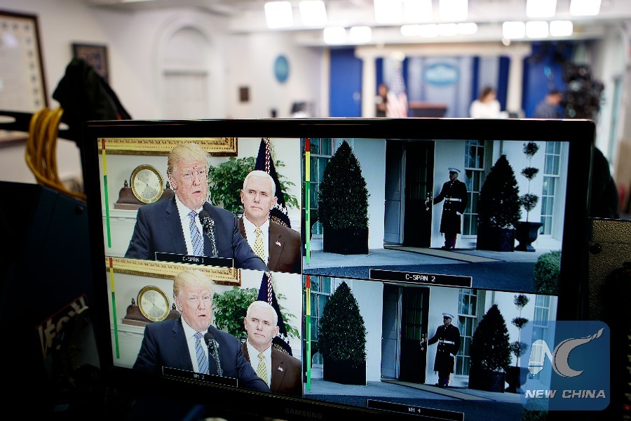 U.S. President Donald Trump is seen on a TV screen announcing tariffs on steel and aluminum, at the White House in Washington D.C., the United States, on March 8, 2018. (Xinhua/Ting Shen)