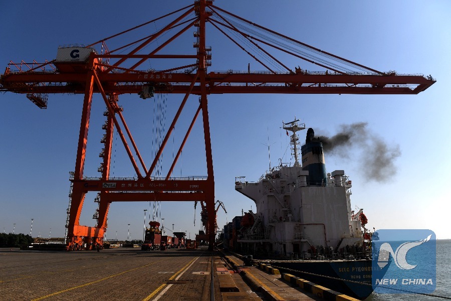 A cargo ship berths at Qinzhou port in Qinzhou, south China's Guangxi Zhuang Autonomous Region, Dec. 19, 2017. The throughput of Qinzhou Port from January to November of 2017 reached 75.47 million tonnes, up 19 percent year on year. (Xinhua/Zhang Ailin)