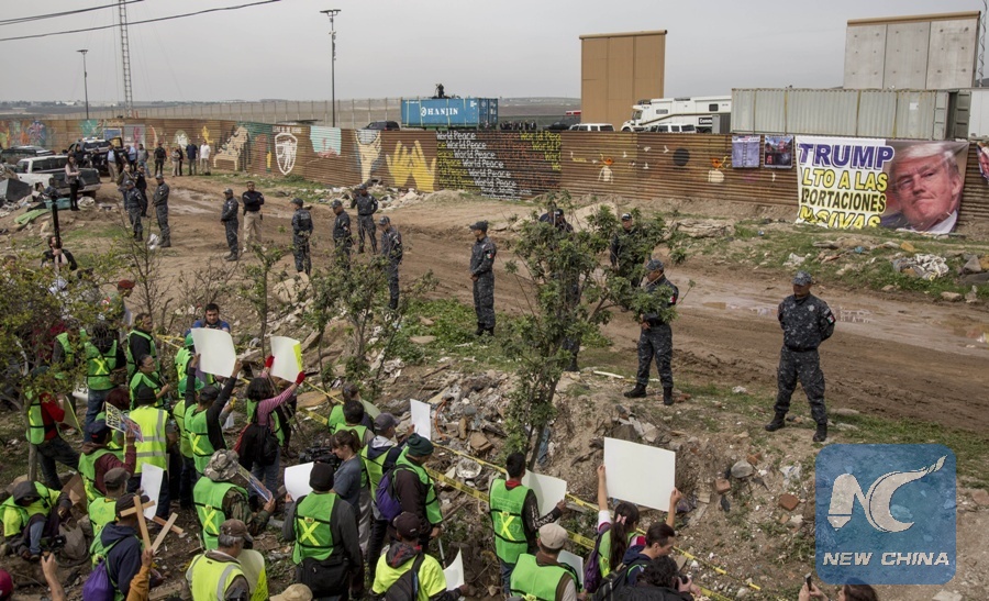 Demonstrators take part in a protest near the Mexico-U.S. border during U.S. President Donald Trump's inspection of the prototypes for the border wall, in Tijuana, Mexico, March 13, 2018. (Xinhua Photo)