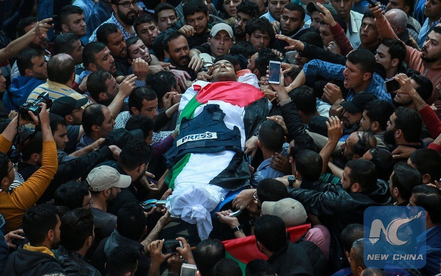 GAZA, April 7 (Xinhua) -- Dozens of Palestinian journalists joined Saturday the funeral of their colleague, who was shot dead while covering clashes between Palestinian demonstrators and Israeli soldiers in eastern Gaza Strip on Friday.
