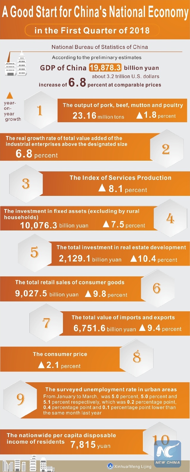 The country's GDP expanded 6.8 percent year on year at comparable prices in the first three months of 2018, unchanged from the growth rate in the previous quarter, the National Bureau of Statistics (NBS) said Tuesday.