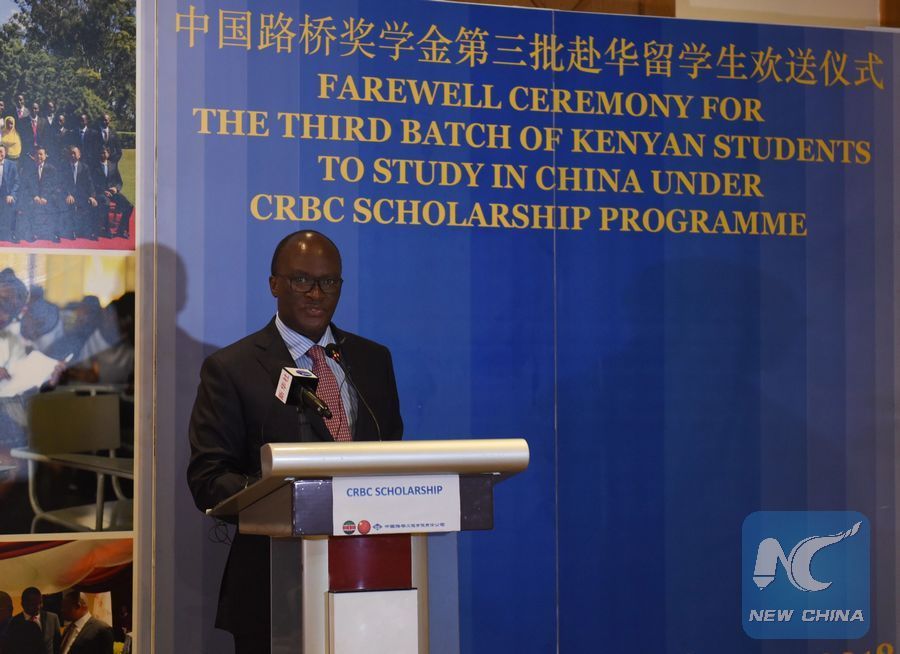 James Macharia, Kenya's Cabinet Secretary for transport, infrastructure and housing, speaks during the farewell ceremony for the third batch of Kenyan students to study in China under CRBC scholarship programme on April 20, 2018. (Xinhua)