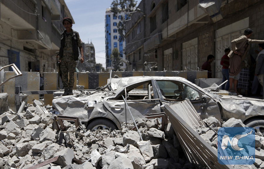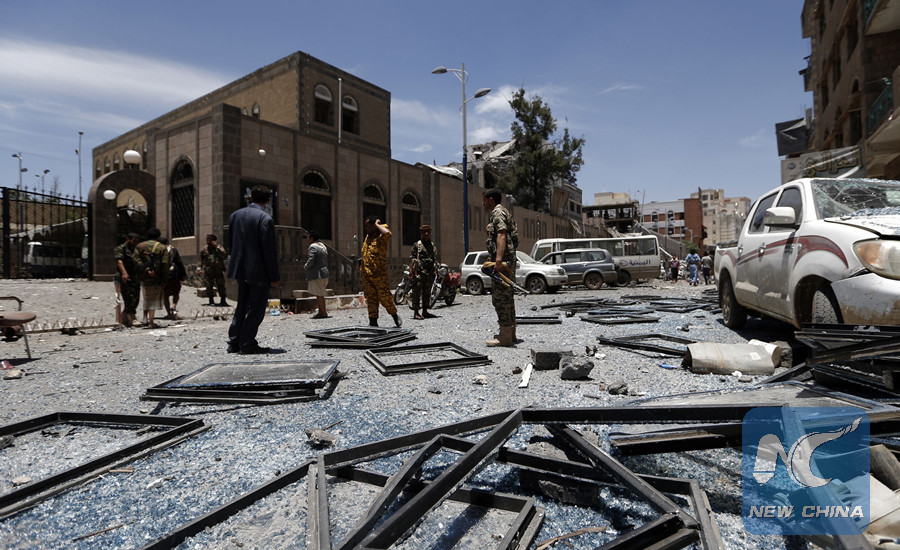 SANAA, May 7 (Xinhua) -- A powerful airstrike by Saudi-led coalition hit the headquarters of presidential office in the Yemeni capital Sanaa on Monday, targeting a secret meeting of Iranian-allied Shiite Houthi leaders and killing at least six, security sources at the scene told Xinhua.