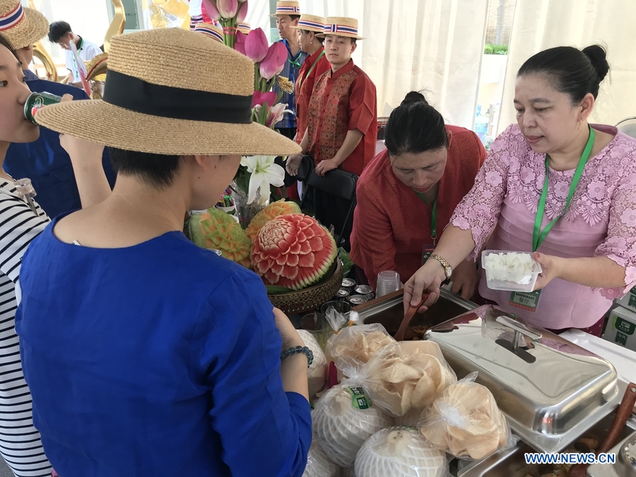 Visitors enjoy Thai food at the Thai Festival 2018 “Spice up Your Day with Thai Tastes”. The festival was held at the Royal Thai Embassy, Beijing, June 23, 2018. This is the second time that the Thai Festival is organised here as guests can enjoy various activities in the midst of Thai surroundings. (Xinhuanet/Liang Yurou)