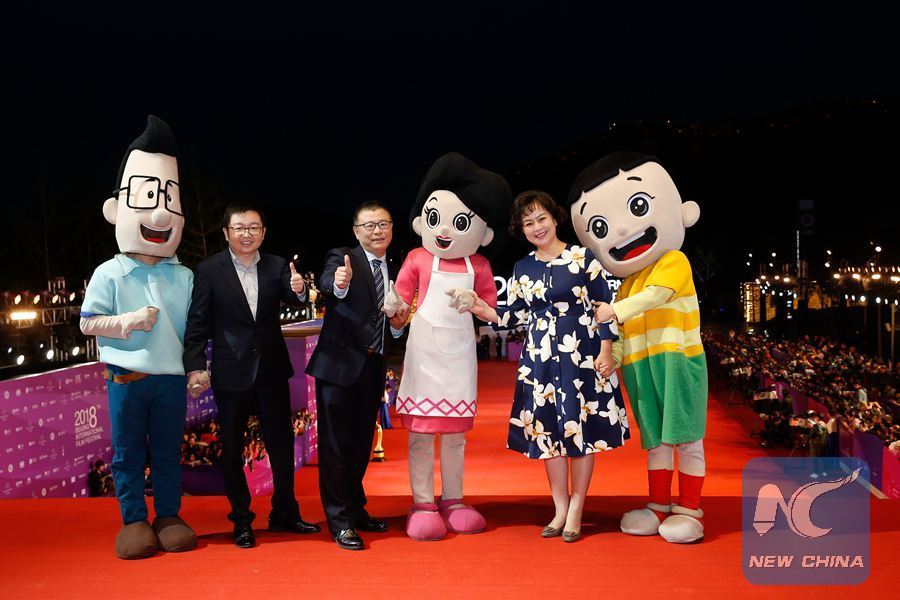 Cast members of the movie "Big Head Son and Little Head Father" pose on the red carpet for the closing ceremony of the 8th Beijing International Film Festival (BJIFF) in Beijing, capital of China, April 22, 2018. (Xinhua/Zhang Yuwei)