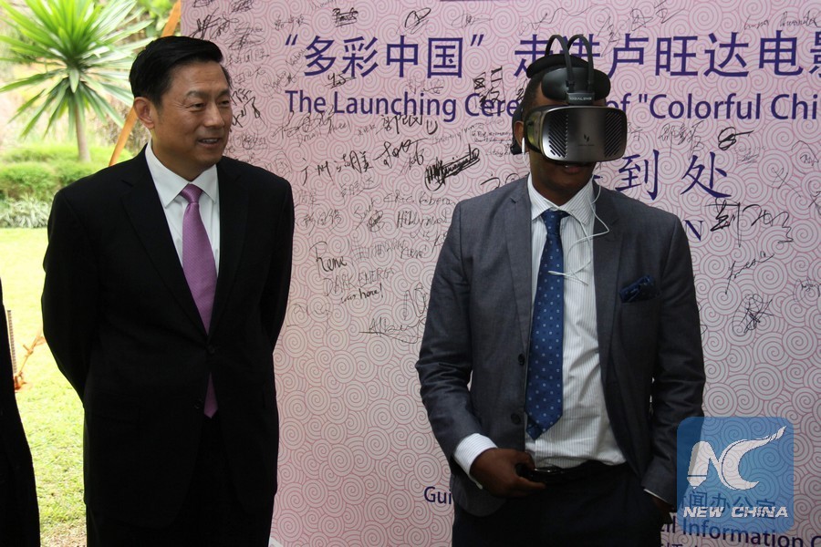 A Rwandan visitor (R) experiences VR video at the launching ceremony of "Colorful China" film panorama in Kigali, capital city of Rwanda on July 7, 2018. (Xinhua/Lyu Tianran)
