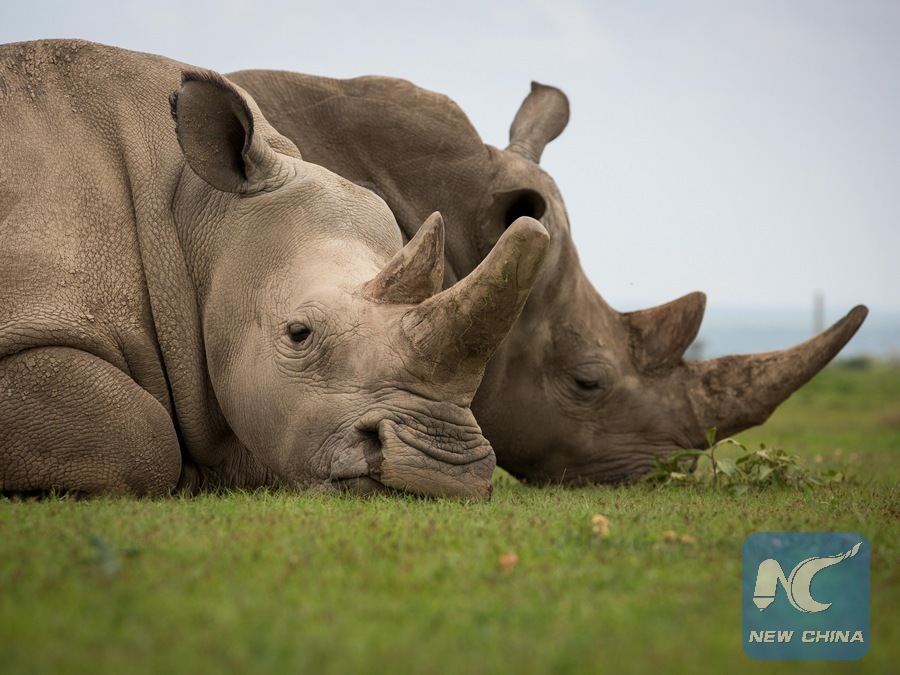 Photo taken on March 30, 2018 shows Fatu (L), one of the world's last two remaining female northern white rhinos, in Ol Pejeta Conservancy in Laikipia county, northern Kenya. (Xinhua/Lyu Shuai)