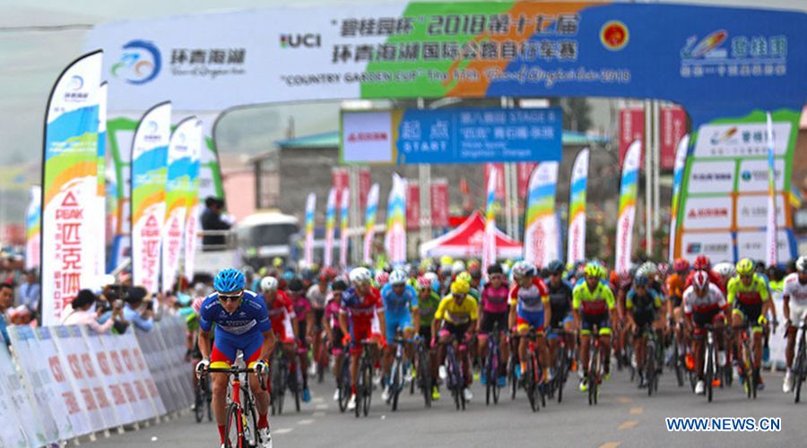 Cyclists compete in the eighth stage of the Tour of Qinghai Lake in northwest China's Qinghai Province on July 29, 2018. (Xinhuanet Photo by Jia Haiyuan)?