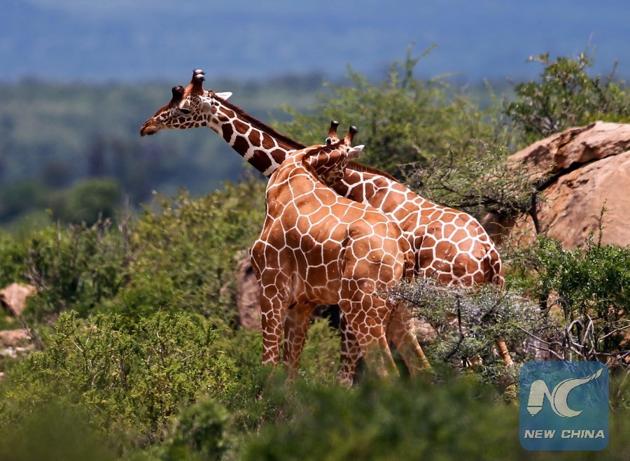 Two reticulated giraffes fight each other at Samburu National Reserve, north of Kenya, April 20, 2013. The Samburu National Reserve is located in northern Kenya with 165 square kilometers in size. It attracts animals because of the Ewaso Ng'iro river that runs through it and the mixture of acacia, riverine forest, thorn trees and grassland vegetation. Grevy's zebra, gerenuk, reticulated giraffes and beisa oryx here are more than those in other regions of the country. Besides, the reserve is also home to lion, crocodile. baboon, elephant and hundreds of species of birds. (Xinhua/Meng Chenguang)