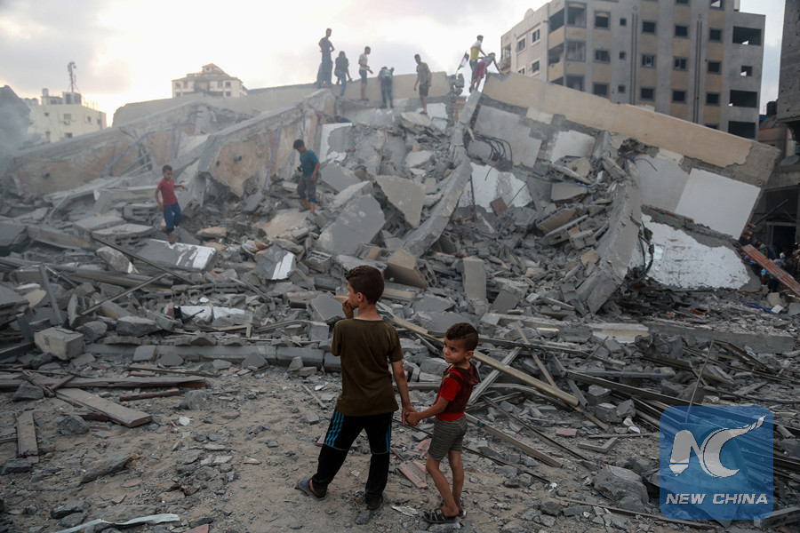 Palestinians walk through the rubble of a building following an Israeli airstrike on Gaza City, on Aug. 9, 2018. (Xinhua/Stringer)