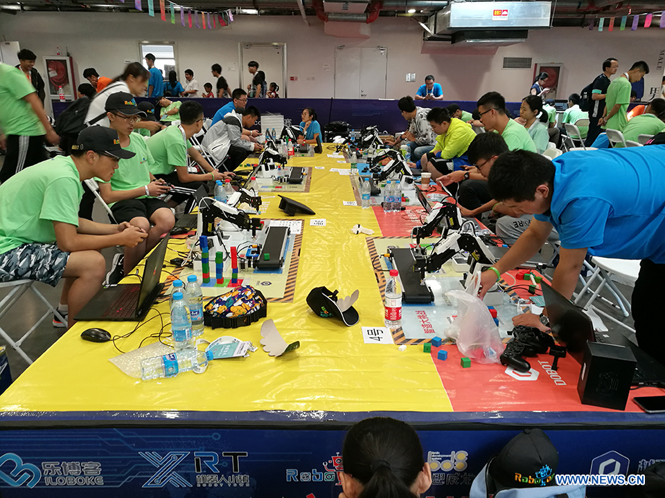 Participants prepare for a contest at the 2018 World Robot Conference in Beijing, Aug. 17, 2018. The conference attracts a total of 166 domestic and international enterprises exhibiting their cutting edge technologies and more than 500 items are displayed at the scene. (Xinhuanet/Yang Pengzhan)