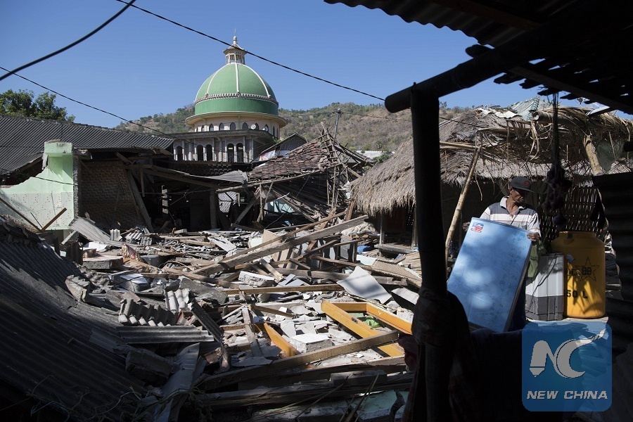 A resident passes by a collapsed building in Lombok island, Indonesia, on Aug. 9, 2018. (Xinhua/Lui Siu Wai)