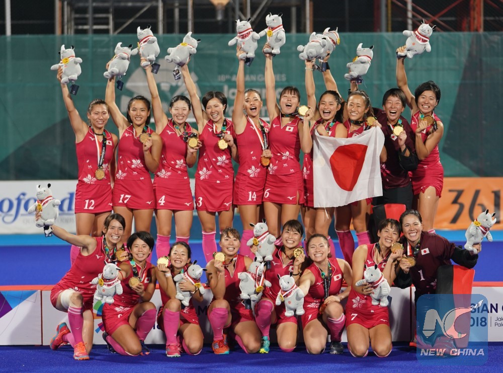 Players of Japan celebrate during the awarding ceremony after the hockey women's final match between Japan and India at the 18th Asian Games in Jakarta, Indonesia, Aug. 31, 2018. (Xinhua/Wang Yuguo)