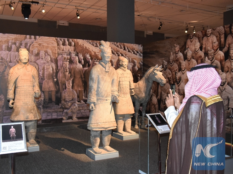 A Saudi visitor takes pictures of the Terra-Cotta Warriors at the exhibition "Treasures of China" in Riyadh, Saudi Arabia, on Sept. 12, 2018. (Xinhua/Tu Yifan)