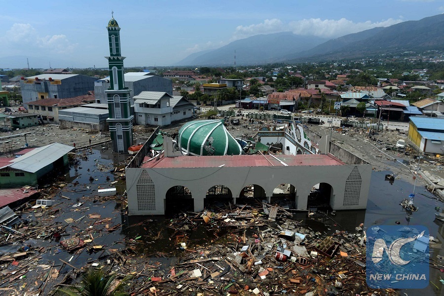 Photo taken on Oct. 4, 2018 shows a collapsed mosque in the wake of an earthquake in Palu, Indonesia. (Xinhua/Agung Kuncahya B.)