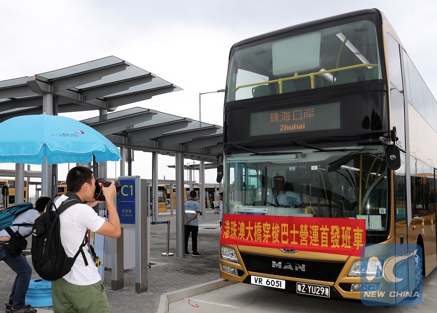 Photo taken on Oct. 24, 2018 shows the first cross-boundary shuttle buse which starts from the Hong Kong Boundary Crossing Facilities and runs to Zhuhai. (Xinhua/Li Gang)