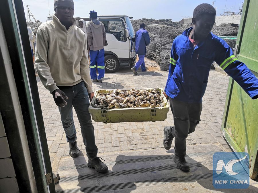 Workers carry oysters at Tetelestai, an oyster producing company in Walvis Bay, a coastal town of Namibia, Oct. 30, 2018. (Xinhua/Shi Liwei)
