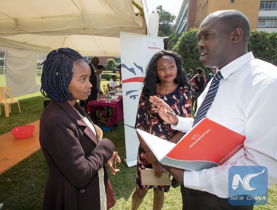 College graduates visit the stand of Prudential Life Assurance at jobs recruitment fair for Kenyan students in Nairobi, Kenya, on Dec. 18, 2018.(Xinhua/Zhang Yu)