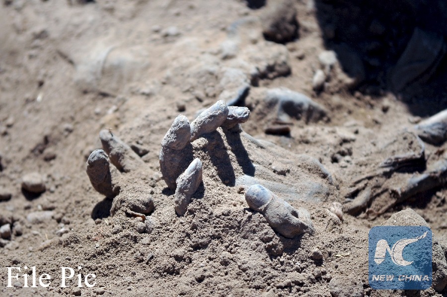 A hand is seen as Iraqi forensic teams recovered dead bodies from a mass grave in the presidential compound of the former Iraqi President Saddam Hussein in Tikrit, on April 6, 2015. (Reuters file photo)