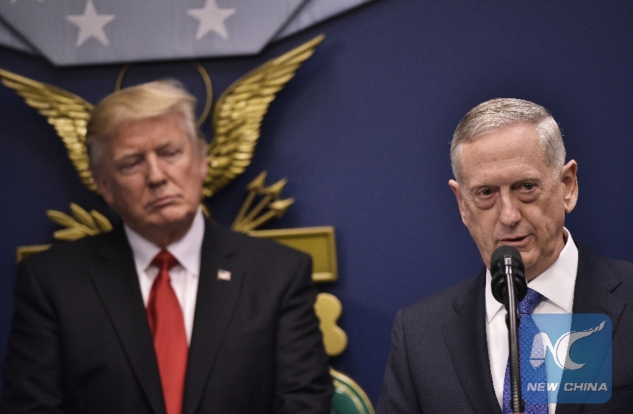 File Photo: U.S. Secretary of Defense James Mattis speaks after his ceremonial swearing-in as secretary of defense watched by U.S. President Donald Trump on Jan. 27, 2017 at the Pentagon in Washington, D.C. (Xinhua/AFP)