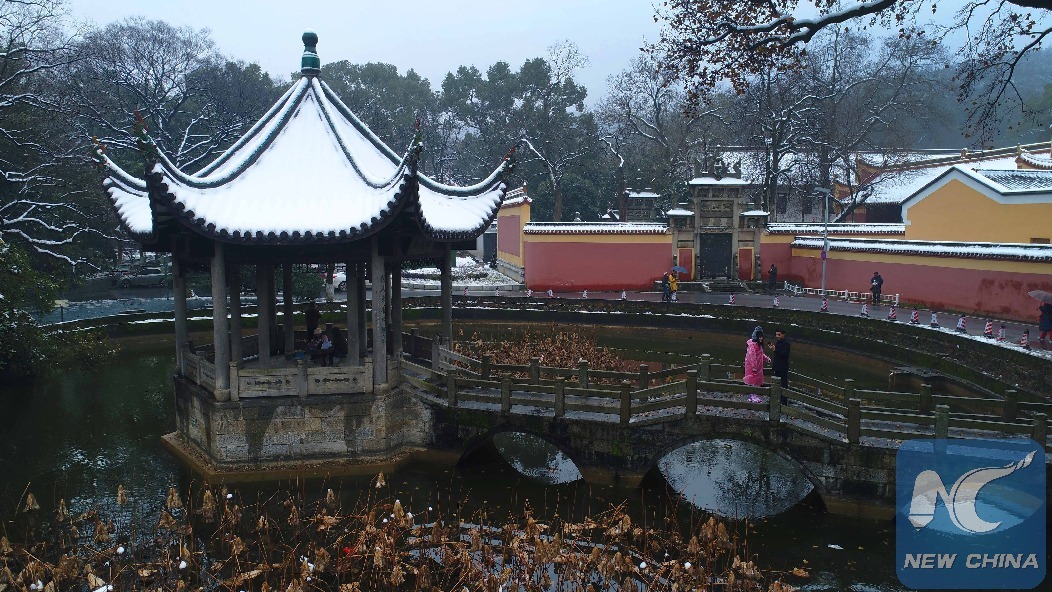 People visit the Chuixiang Pavilion in Hunan University at the foot of Yuelu Mountain in Changsha, capital of central China's Hunan Province, Jan. 2, 2019. The Yuelu Mountain has attracted more tourists after a snowfall recently. (Xinhua/Li Ga) XINHUA PHOTOS OF THE DAY